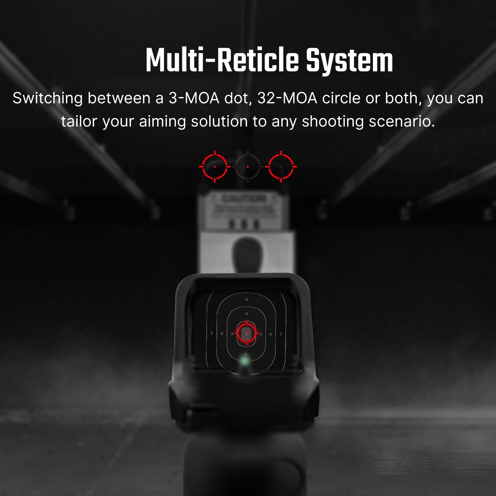 - 3 MOA Dot + 32 MOA Circle: Switching between dot-and-circle, dot-only, or circle-only reticles, you can tailor your aiming solution to any shooting scenario. The sharp and bright dot-and-circle reticle provides a cutting-edge aiming experience.