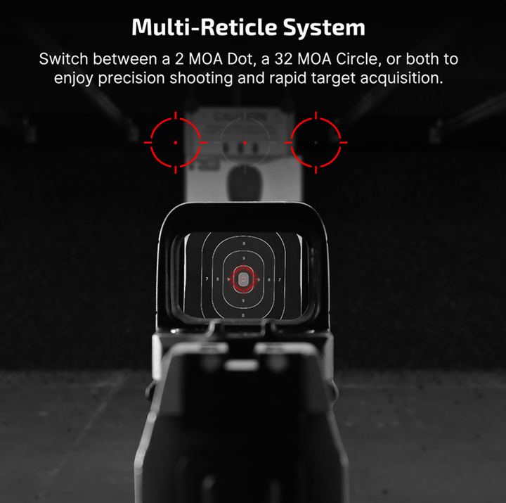 - Multi-reticle System (2 MOA Dot & 32 MOA Circle): Switching between dot-and-circle, dot-only, or circle-only reticles, you can tailor your aiming solution to any usage scenario. The sharp and bright dot-and-circle reticle provides a cutting-edge aiming experience (suitable for outdoor activities, shooting training, and night patrols).