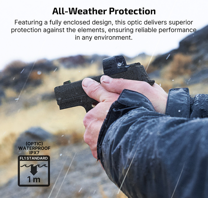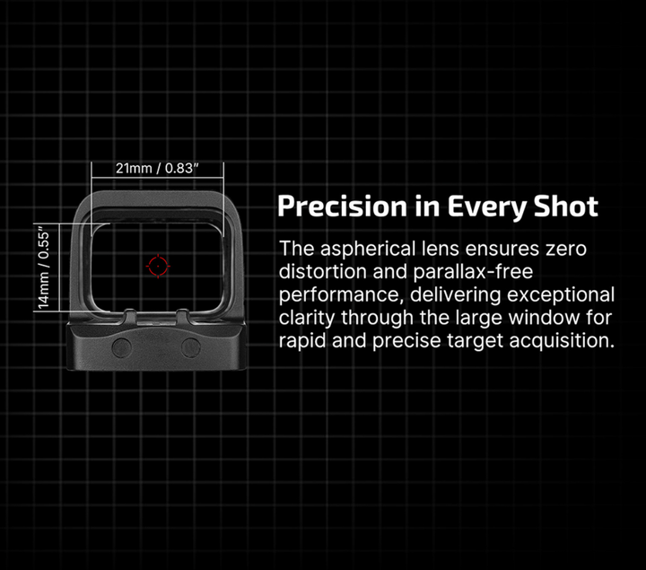 - Enclosed Optic with Aspherical Lens: Designed with a fully sealed system, the optic offers unmatched protection against environmental elements. Its aspherical lens ensures zero distortion and parallax-free performance, delivering exceptional clarity through the large window for rapid and precise target acquisition.