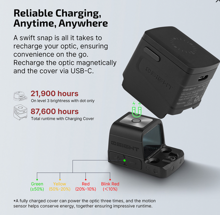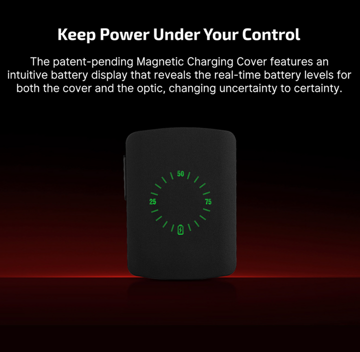 - Industryʼs First Magnetic Charging Cover: The Osight S boasts a pioneering Magnetic Charging Cover featuring a battery display that reveals the real-time battery levels for both the cover and the optic, making uncertainty certain. (The magnetic charging cover can fully charge Osight S 3 times, with each charge completed in 1.5 hours.)